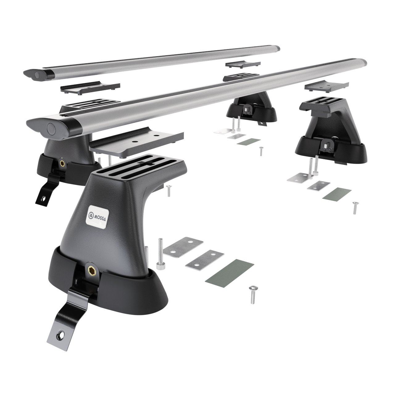 - 4 Fußsätze (Halter) – für standardmäßige Dächer ohne werkseitige Fixpunkte – Montage am Dachrand, Tragfähigkeit 50 kg (oder gem. Empfehlungen des Fahrzeugherstellers).