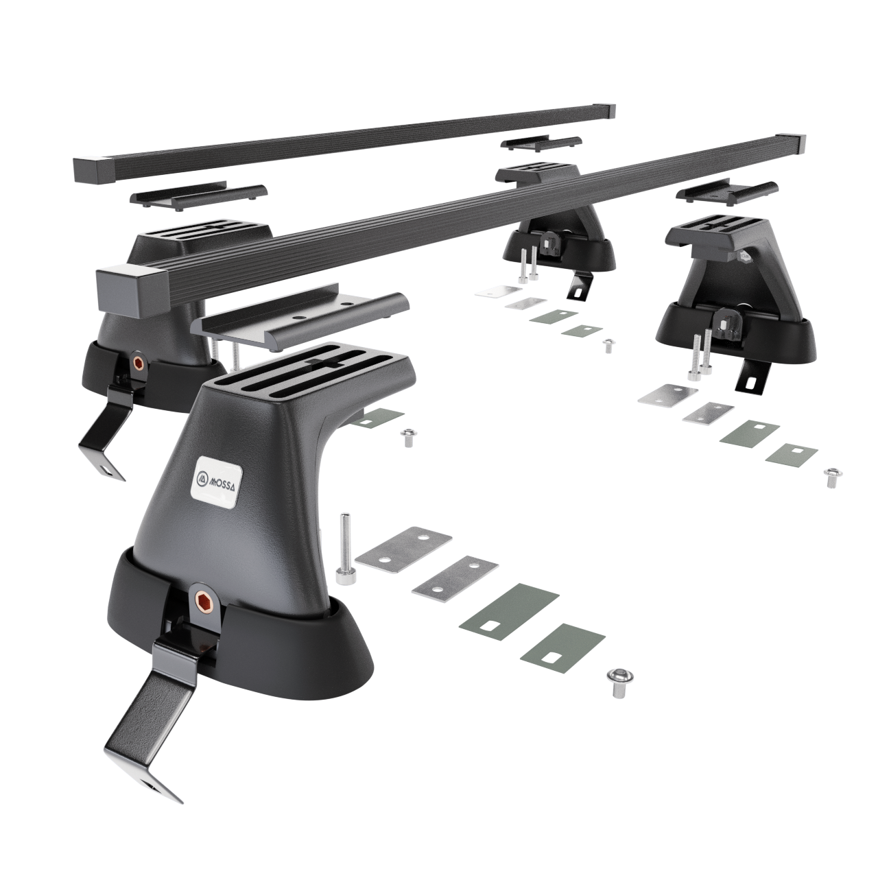 - Der Basisdachträger besteht aus 2 soliden Stahlbalken und 4 Haltern (sog. Fußsätze), die an den Typ und Generation des Fahrzeugs angepasst sind.