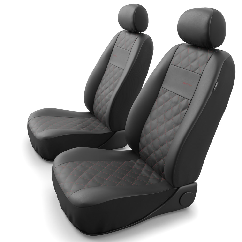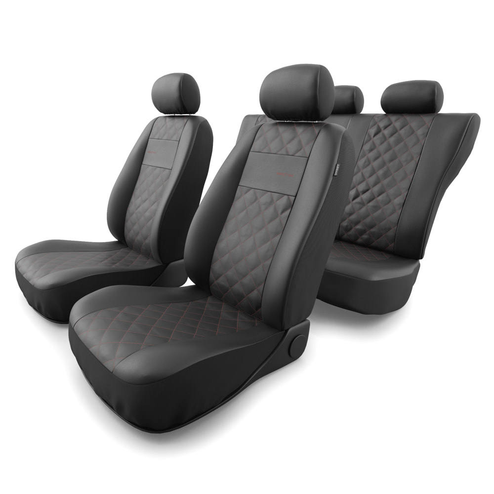 - Die Sitzbezüge bestehen aus strapazierfähigem, schmutzabweisendem schwarzem Kunstleder mit dekorativer Steppung in Rot in der Mitte. Die Vorderseiten der Bezüge sind zusätzlich bestickt.