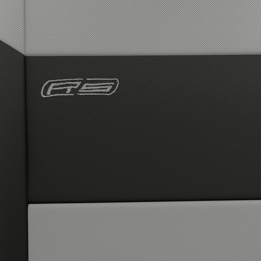 - Die Bezüge bestehen aus schwarzem Polsterstoff mit einem Mittelteil aus Hellgrau-Stoff. Auch auf der Vorderseite sind sie mit einer sportlichen Stickerei versehen.