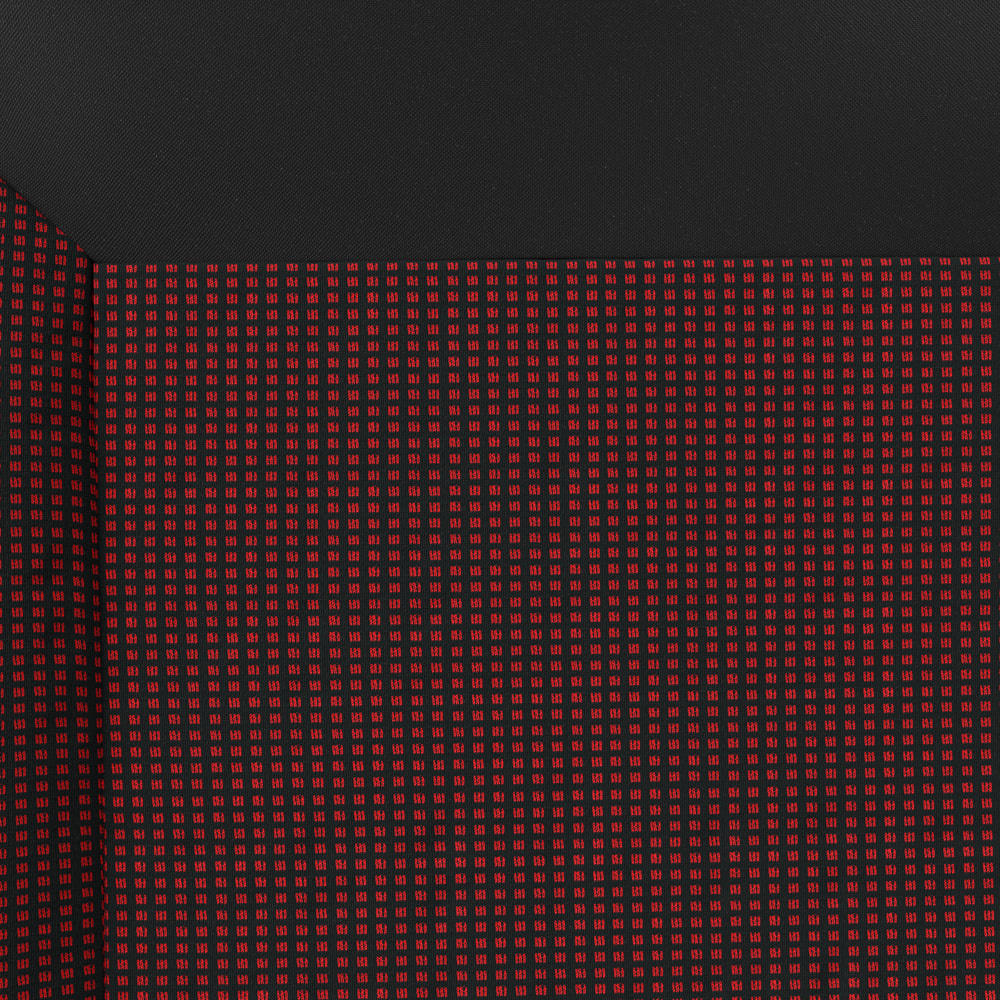 - Die Bezüge bestehen aus schwarzem Polsterstoff mit einem Jacquard-Einsatz in Rot in der Mitte.