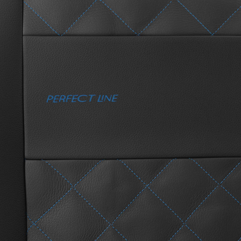 - Die Sitzbezüge bestehen aus strapazierfähigem, schmutzabweisendem schwarzem Kunstleder mit dekorativer Steppung in Blau in der Mitte. Die Vorderseiten der Bezüge sind zusätzlich bestickt.