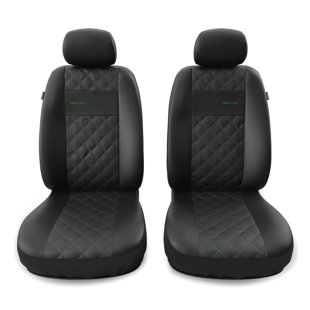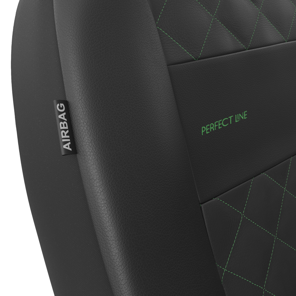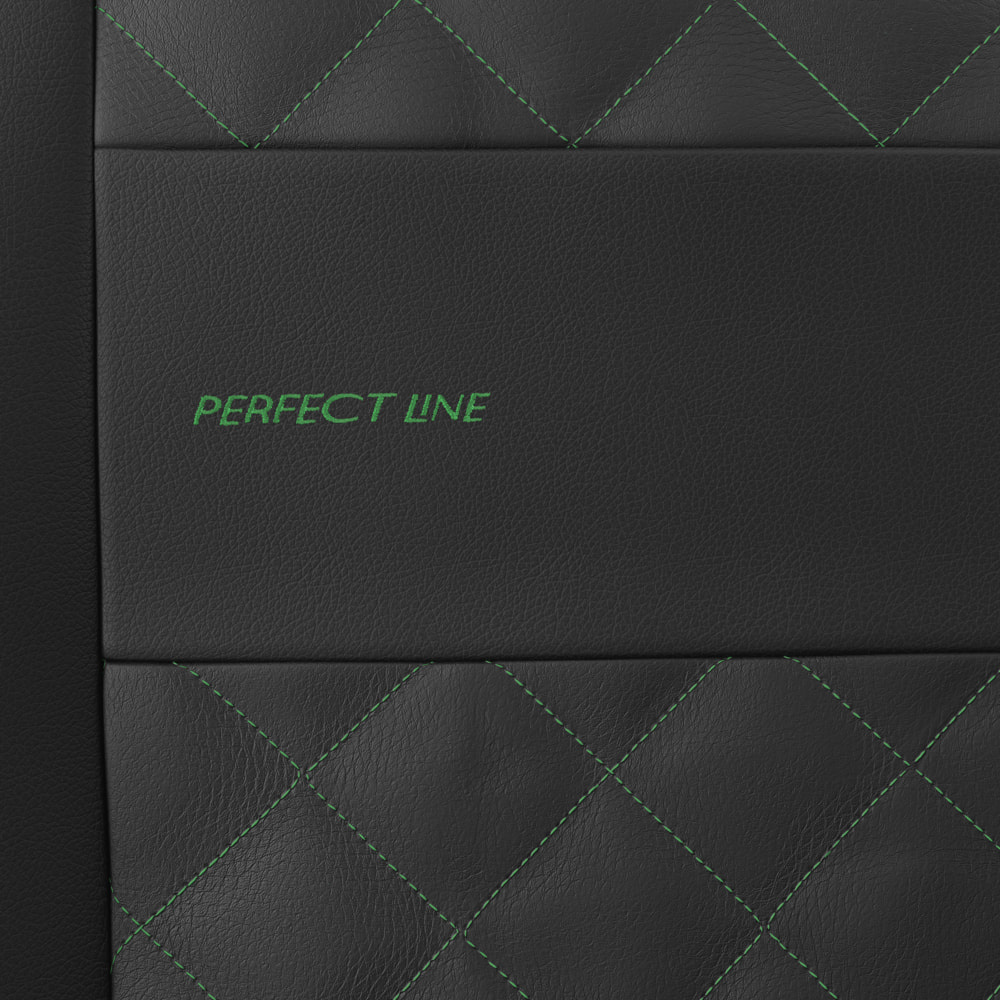 - Die Sitzbezüge bestehen aus strapazierfähigem, schmutzabweisendem schwarzem Kunstleder mit dekorativer Steppung in Grün in der Mitte. Die Vorderseiten der Bezüge sind zusätzlich bestickt.