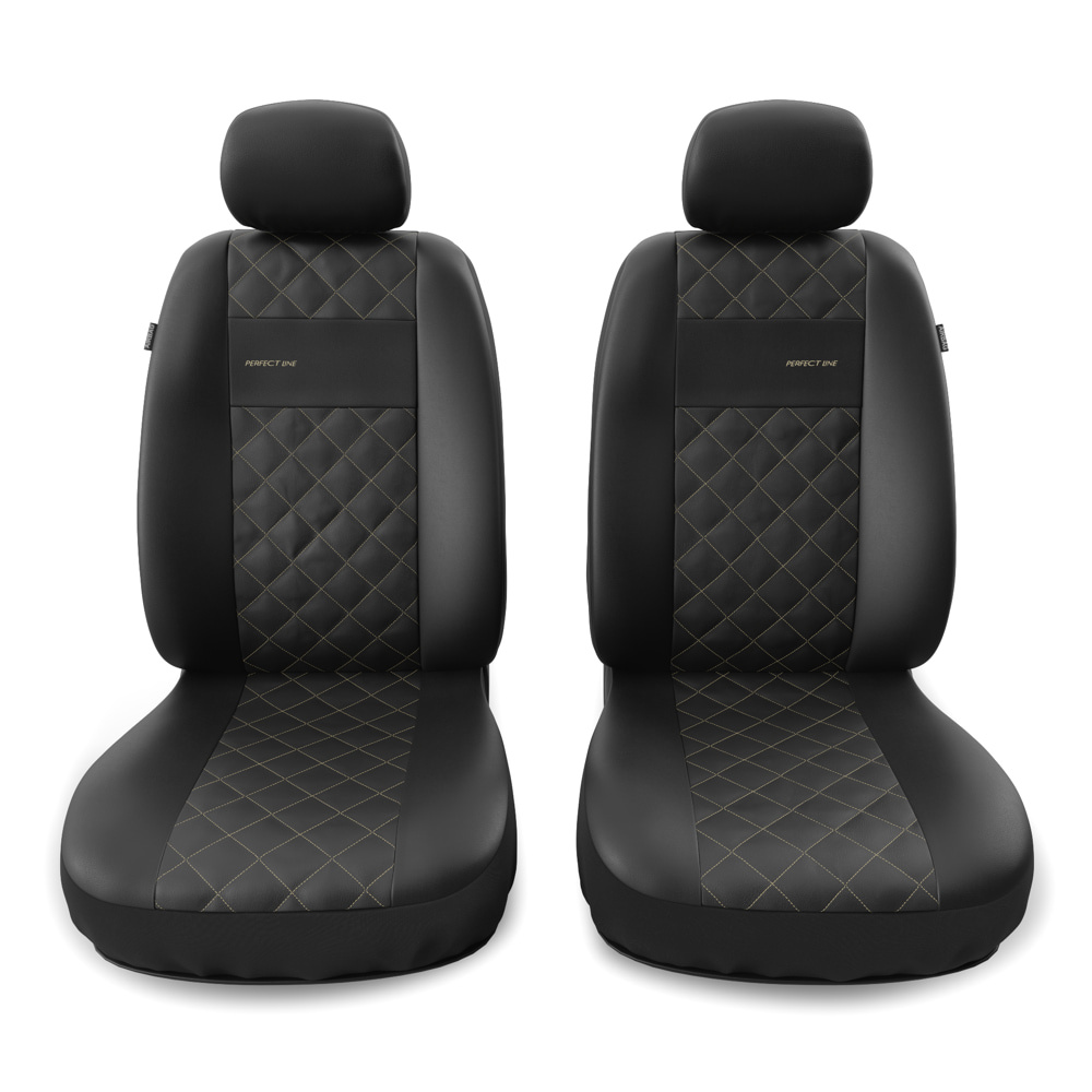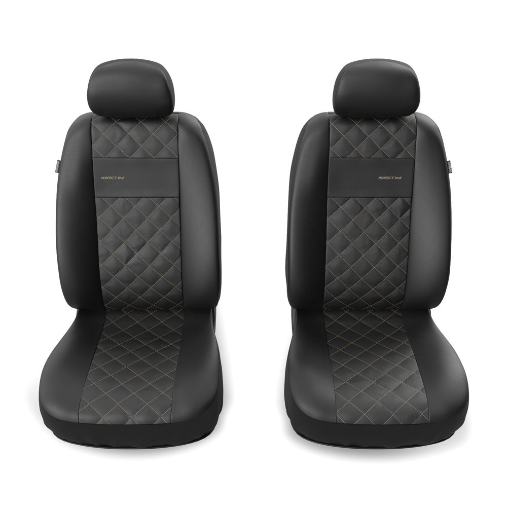 - Die Sitzbezüge bestehen aus strapazierfähigem, schmutzabweisendem schwarzem Kunstleder mit dekorativer Steppung in Beige in der Mitte. Die Vorderseiten der Bezüge sind zusätzlich bestickt.