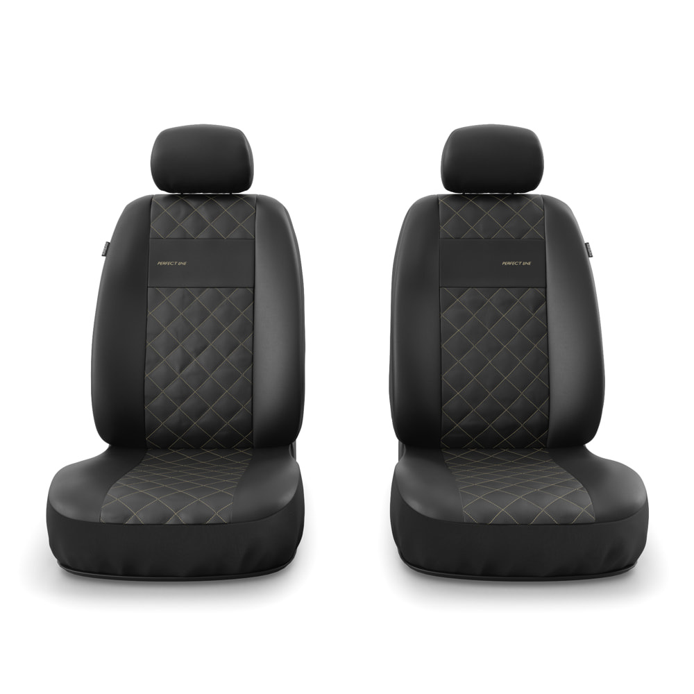 - Die Sitzbezüge bestehen aus strapazierfähigem, schmutzabweisendem schwarzem Kunstleder mit dekorativer Steppung in Beige in der Mitte. Die Vorderseiten der Bezüge sind zusätzlich bestickt.
